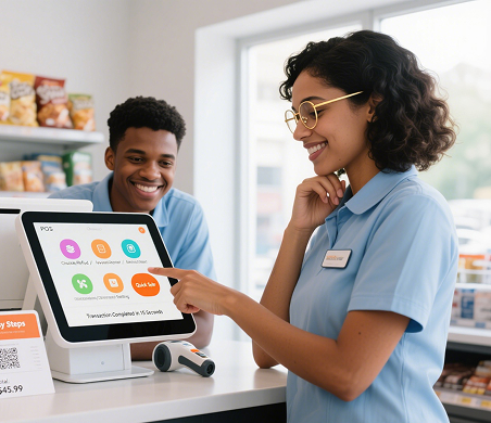 At a retail clothing store, a customer purchases an item. The cashier scans it with a POS machine, processes the payment via card or mobile, and instantly completes the transaction—generating an electronic receipt.